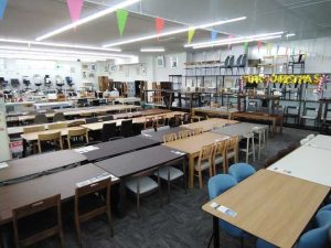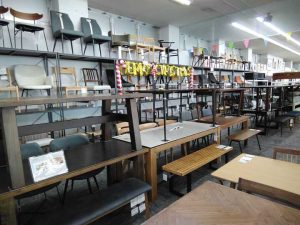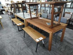 テーブルやチェアはもちろん、今人気のベンチも見やすく並んでおります!