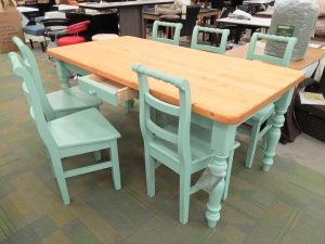 テーブルの脚と椅子はミントグリーンで、個性的かつおしゃれなアクセントになっています。
