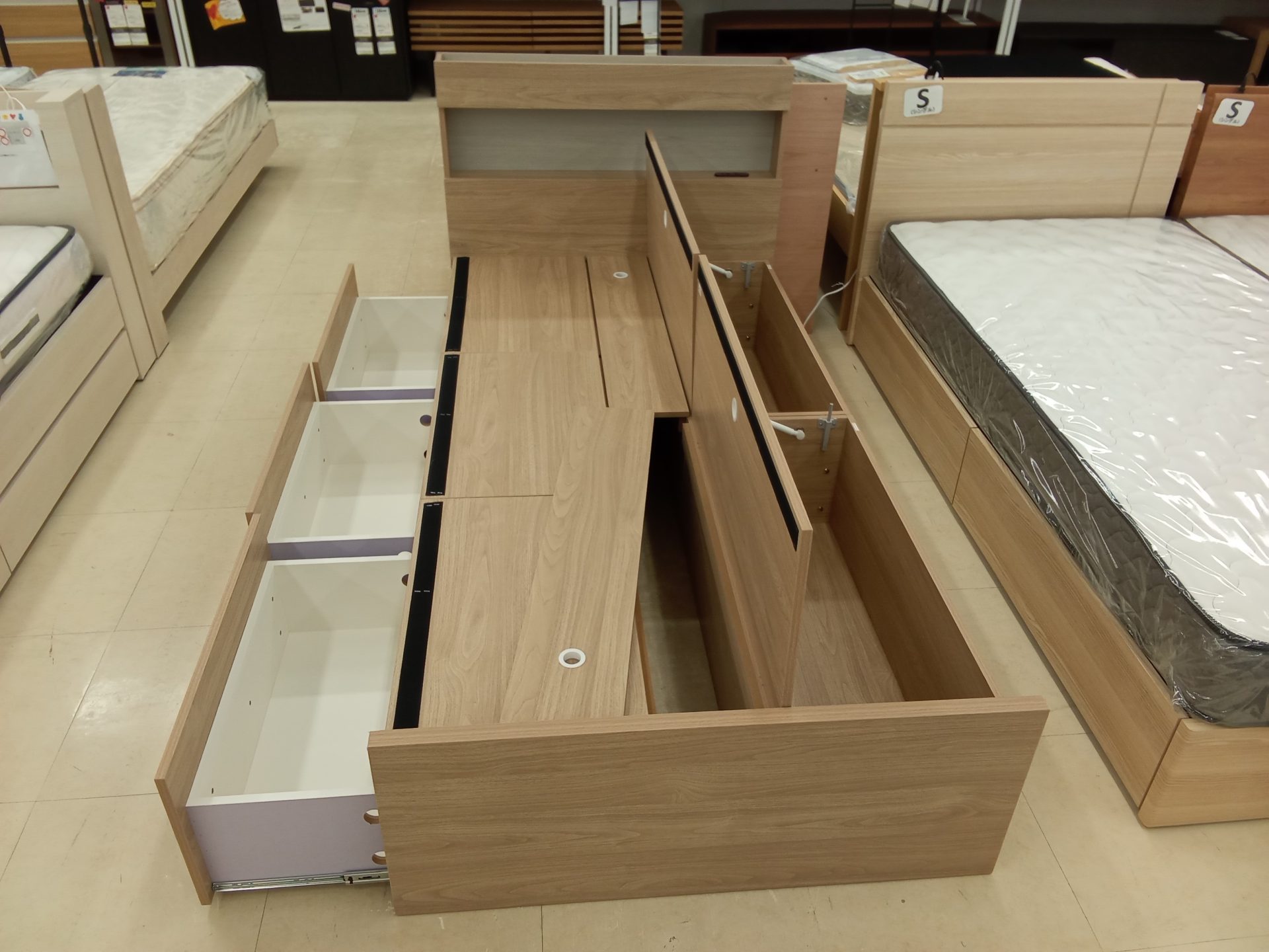 引き出しフルオープンだから出し入れしやすく、跳ね上げ収納もあり、真ん中のデッドスペースまで有効活用できます。